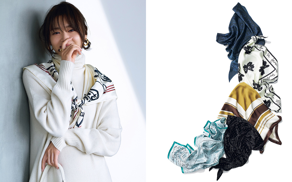 2|肌当たりがなめらかなシルク素材のスカーフは、万能なモノトーン。エレガントな花柄が着こなしのポイントに。スカーフ¥15,400(アルアバイル)