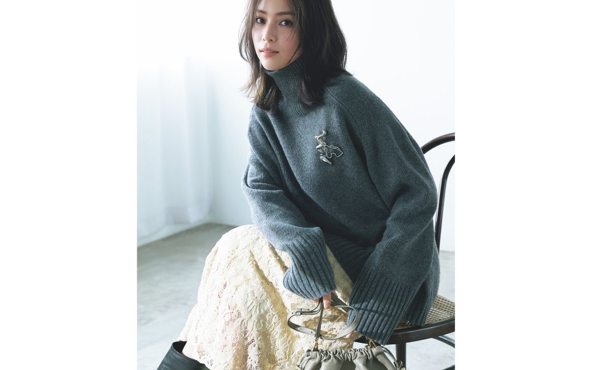 シルバーでまとめたブローチをグレータートルになじませて品よく