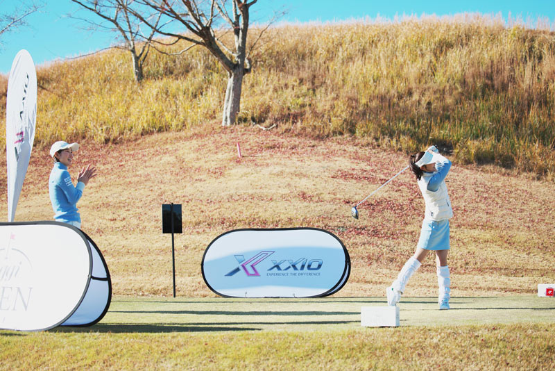 そして、Oggi OPEN GOLF恒例、参加者とのドラコン対決に臨む古畑星夏ちゃんにはドライバーで飛ばすコツをワンポイントアドバイス。