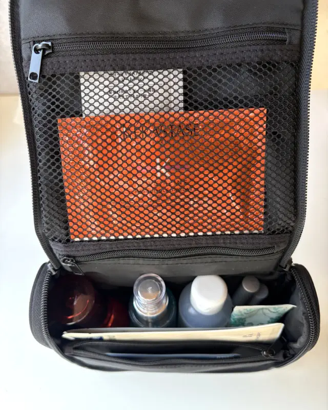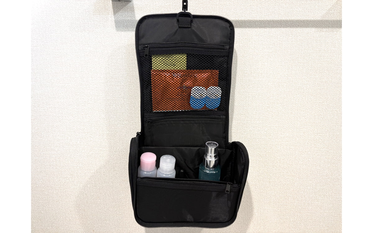 いつも一泊〜二泊するときに使っているアイテムを実際に詰めてみました。縦に長いアイテム(化粧水やヘアミストなど)も、立てたまま無理なく収納できるのがかなり便利。そして、ポケットや仕切りごとに定位置が決めやすく、パッと見ただけでどこに何が入っているかが一目で分かります! これなら、滞在先でもいつもと同じアイテムをスムーズに取り出して使うことができ、ストレスをしっかり減らしてくれます。そして立てたままでも使えるので、洗面台やホテルの狭いスペースでも中身が見やすく、使い勝手の良さを感じます。