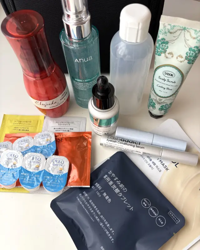 中身をすべて出して並べてみると、収納力の高さがよりはっきり分かります。スキンケア・ヘアケア・歯磨き系まで一式まとめて入れても、無理なく収まるサイズ感。パッキングも片付けも驚くほどスムーズになります。