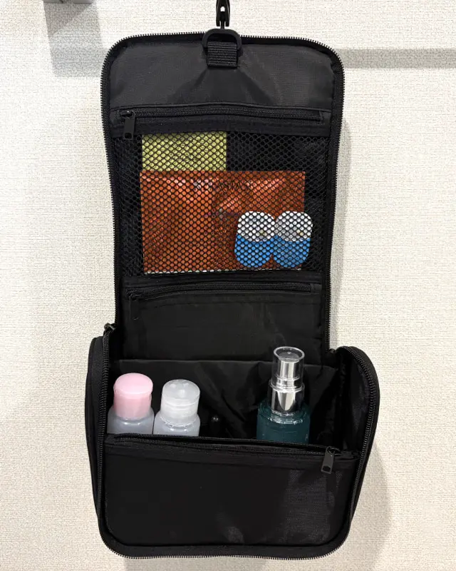 フックで吊るしてみると、このケースの便利さが一気に実感できます。 洗面台やドアノブに掛けるだけで、中身がすべて見えてそのまま使えるのが本当にラク。限られたスペースの宿泊先でも、置き場に困らず“自分専用の洗面コーナー”が完成します。 使い終わったらサッと閉じてそのまま持ち運べる優れものです♡