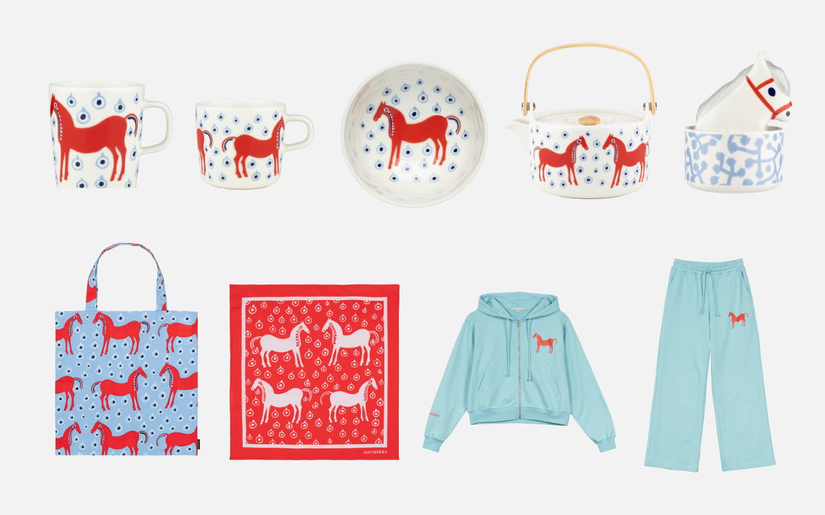 午年の幕開けを記念する今回のコレクションでは、マリメッコのアーカイブプリントから、マイヤ・イソラによって1954年にデザインされた「ムスタ・タンマ」をフィーチャー。マイヤ・イソラの幼少期の記憶に着想を得たこのプリントには、馬の群れとともに森を駆け抜ける自身の姿を思い描く、彼女の創造性が反映されています。スカイブルー、ソフトピンク、鮮やかなレッドのダイナミックな色使いも魅力です。