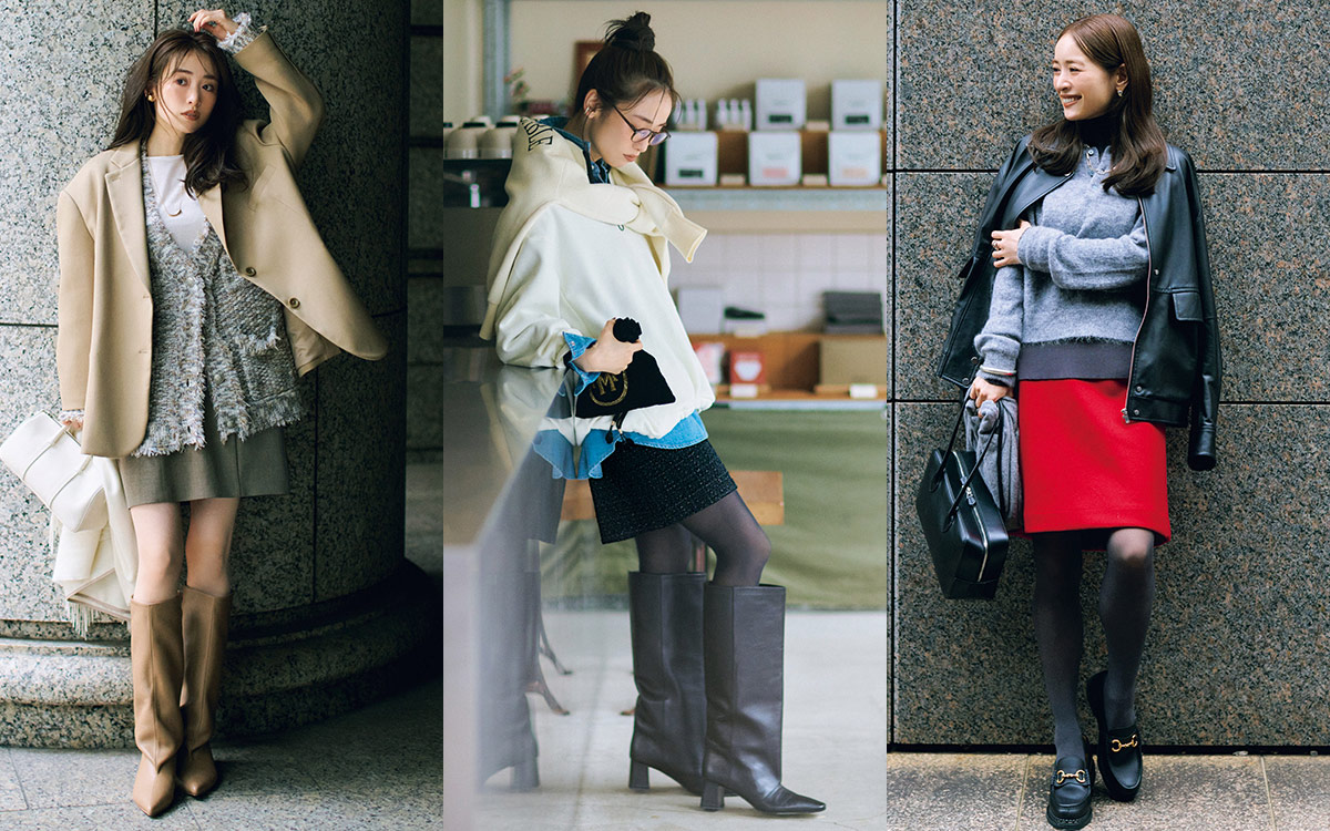 足元はロングブーツやサイドゴアブーツ、ソックス+ローファーなどで、ミニ丈とのボリューム感のバランスを取って。