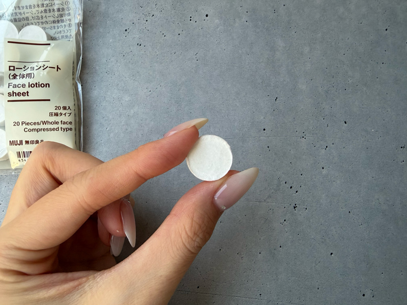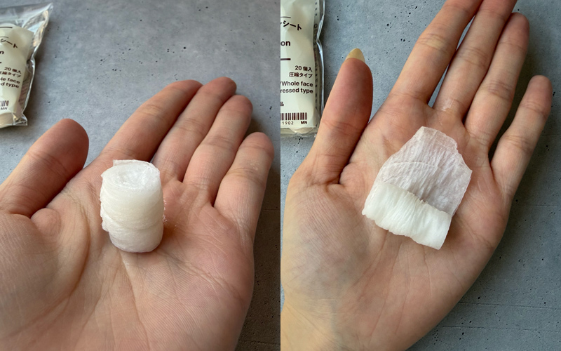 ひとつ取り出してみると、想像以上に小さくて軽いのが第一印象。ぎゅっと圧縮されていて「これが本当に顔全体分?」と思うほどコンパクトです!