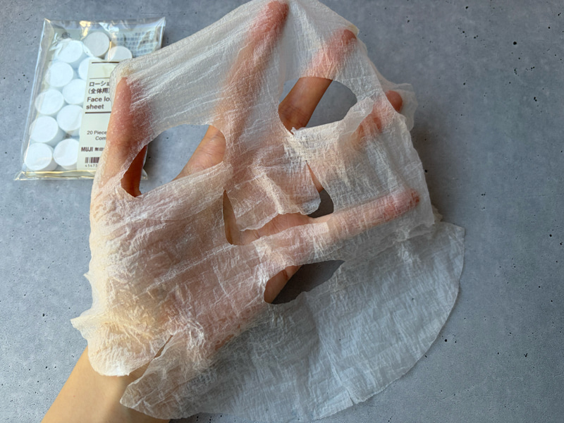 すべて広げてみると、シートはかなり薄めで肌への密着感を重視したタイプ。厚みのあるマスクというよりは、化粧水をそのまま肌にのせるためのアイテムという印象です。ただ、その分化粧水の感触をダイレクトに感じやすいのが特徴だと感じました。
