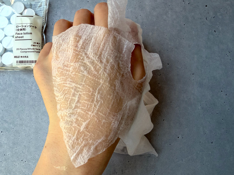 実際に化粧水を浸していくと、ぎゅっと固まっていたシートがふわっと広がっていきます。ただ、少しとろみのある化粧水を使ったせいか、量が少ないと潤いが行き渡るまでにやや時間がかかる印象でした。化粧水の量をしっかり増やすとシート全体にきちんと行き渡って、ムラなく浸透し広げることができました!