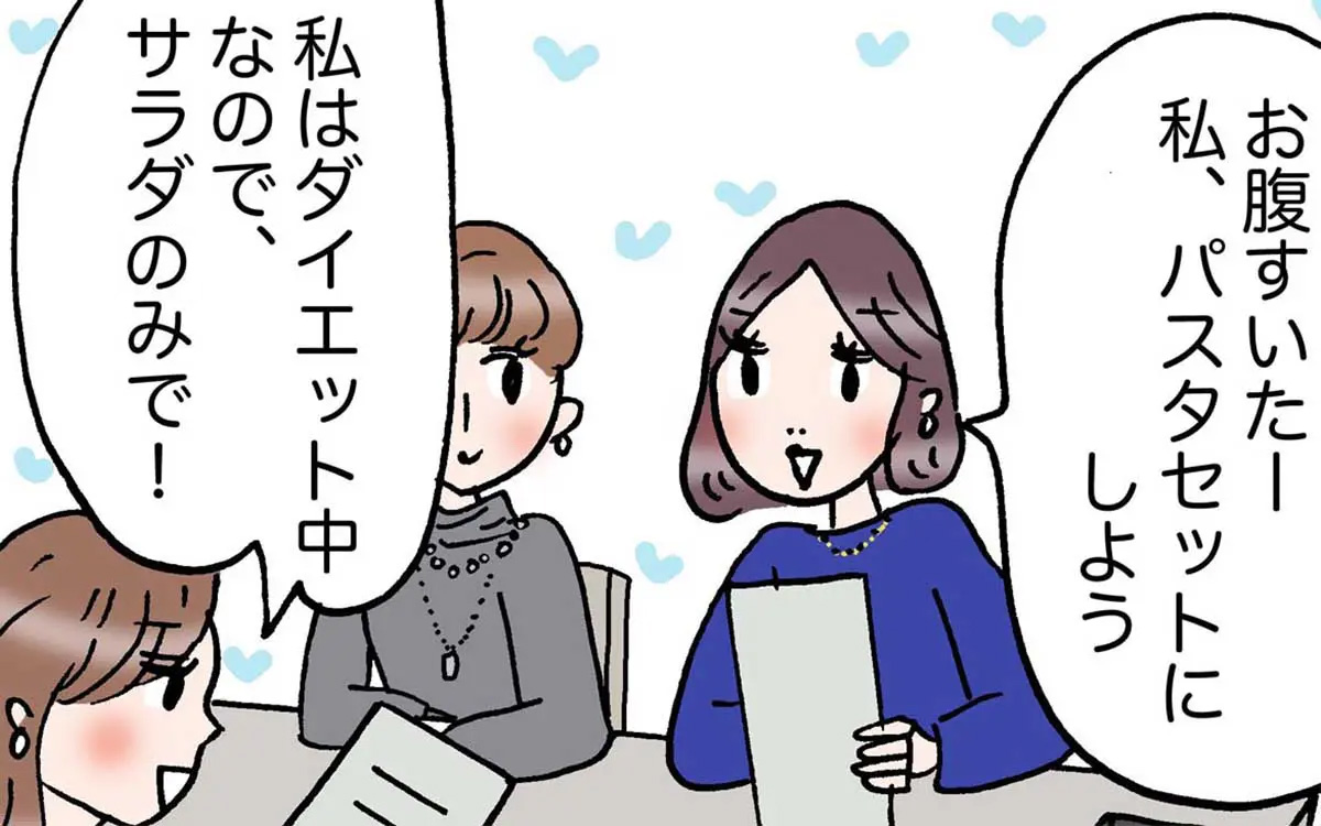 キレイ田さんはダイエット中のため、サラダを! だけど、みんなの料理が美味しそうで…?