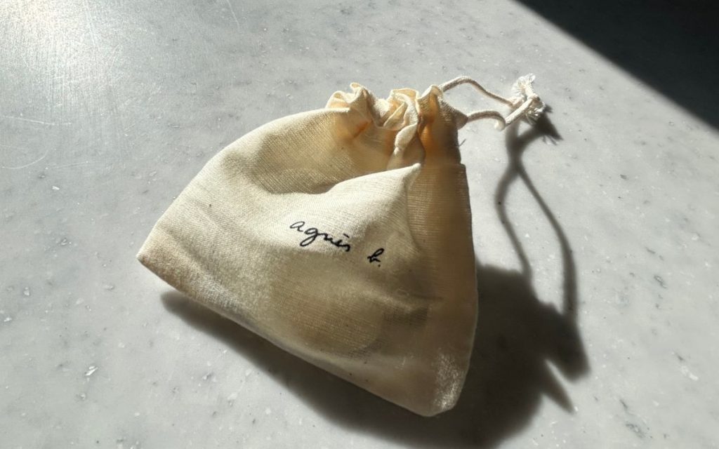 プレートのサイズはさほど大きくないので、さりげないお団子ヘアに飾ったらいい感じの主張具合い。さすがアニエスだなあ、わかってるなあ、と思わせてくれるアイテムです。白ベースに黒いロゴバージョンの色違いもかわいかった!シンプルな収納袋に入っているのも素敵で、ちょっとしたプチギフトにもよさそうです。