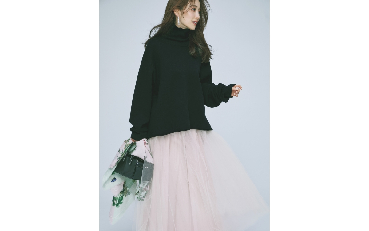 〝ハー〟のコットンカシミヤニットは、厚さとハリ感がほどよく、カットソー感覚で着られる一枚。ボトムスを選ばない万能さで、インパクトのあるチュールスカートの甘さを抑えて、きれいめなムードに落とし込む。