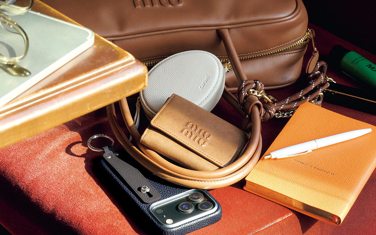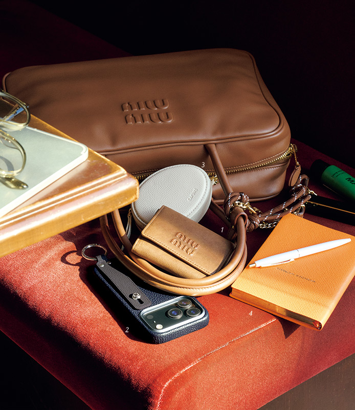愛用するバッグとリンクさせたミニ財布、服の色を選ばず機能的なスマホケース、すぐに見つけやすい色のポーチと上質なノート。バッグの中のスタメンは「好き」と「便利」を両立する厳選アイテムで構成!