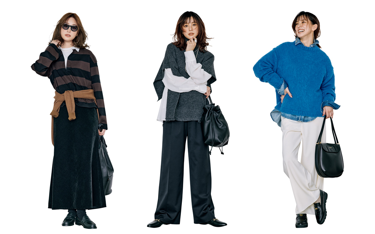 上級感が出るニットポンチョを使った装いこそ、足元は正統派な黒ローファーが適任。ビットがさりげないアクセントとなって、黒パンツをつないだときに埋もれないのがいい。靴¥34,100(伊勢丹新宿本店 本館2階 婦人靴〈ファビオ ルスコーニ〉) ニット¥8,910(ワールド プレスインフォメーション〈クロエンス〉) シャツ¥31,900(カオス丸の内〈カオス〉) パンツ¥53,900(LITTLE LEAGUE INC.〈エブール〉) バッグ¥53,900(ヴァジックジャパン〈VASIC〉) ピアス¥16,500(エルディスト ショールーム〈ジャミレイ〉) ネックレス[短]¥58,300(マリハ) ネックレス[長]¥72,600(ZUTTOHOLIC〈バルブス〉) リング¥22,000(フーブス〈IRIS47〉)