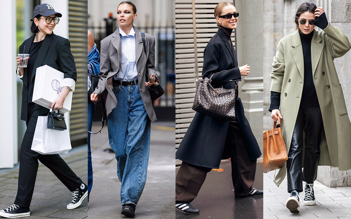 「海外スナップ常連のマリア・バルテチコは、大人ならではのスニーカーの着こなしが参考になる! 黒のコンバースをヘビロテしているのをスナップでよく見かけます。ジャケットセットアップのきちんと感はキープしつつ、黒スニーカーで力の抜けた洒落た雰囲気に」(広田)