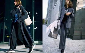 3:黒で引き締まった足元なら ボリュームアウターとも好バランス