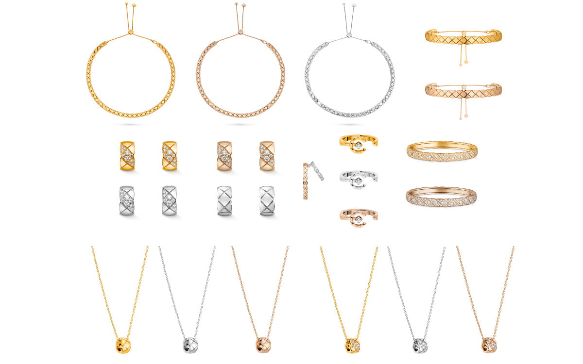 どちらもキルティングモチーフをメッシュ加工で繋ぎ合わせ、クラスプにスライディングシステムを採用することで、完璧なフィット感と容易な長さ調整を実現。ショートネックレスはベージュゴールド、イエローゴールド、ダイヤモンドをあしらったホワイトゴールドの3タイプを、チョーカーはベージュゴールド、イエローゴールドの2タイプを揃えます。