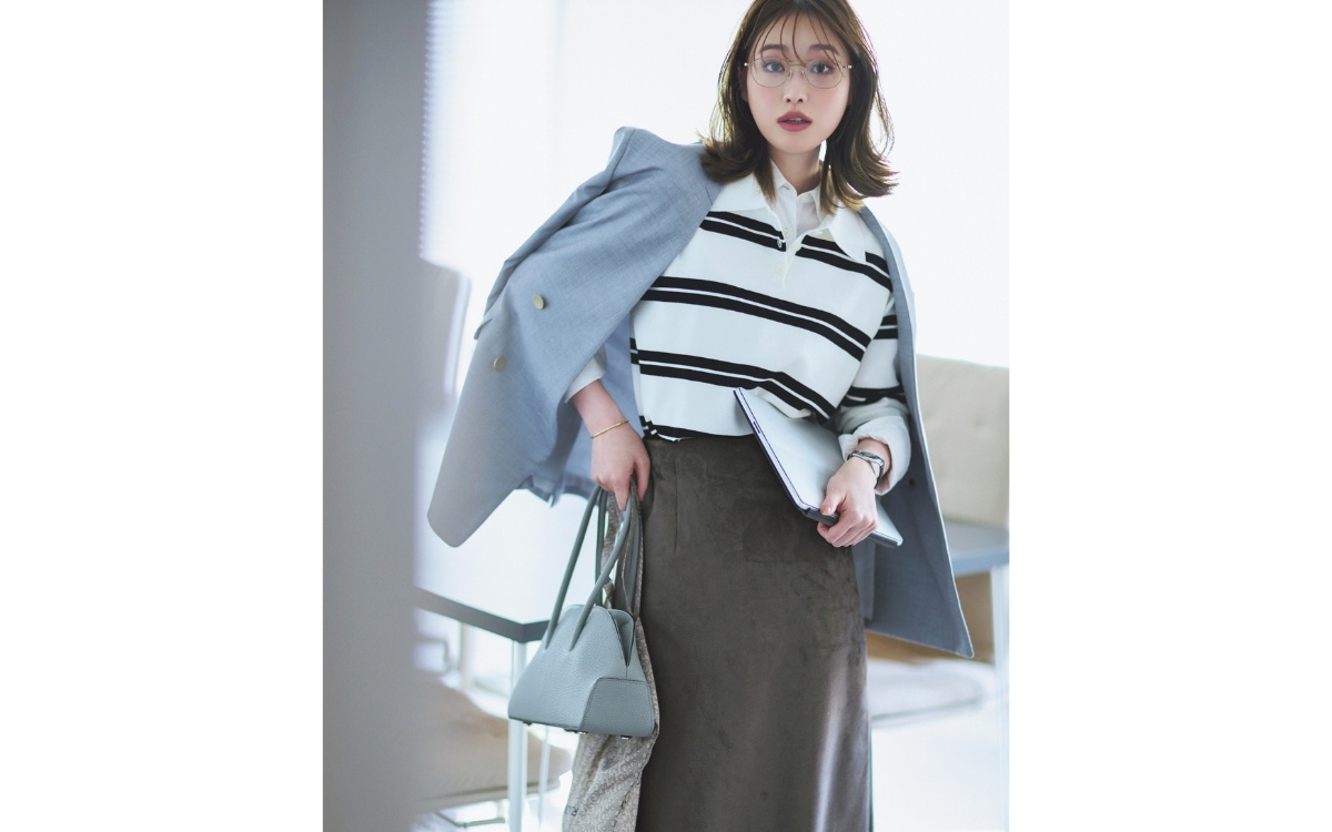 ジャケット¥80,300(LITTLE LEAGUE INC.〈エブール〉) ポロニット¥18,700(LOUNIE/ルーニィ) 中に着たシャツ¥23,100(カレンソロジー 青山〈アンド アールシー〉) スカート¥15,950(アバハウスインターナショナル オンラインストア〈ルージュ・ヴィフ〉) レザーバッグ¥110,000(エポイ 本店〈エポイ〉) トートバッグ¥4,180(THIRD MAGAZINE) メガネ¥49,500(アイヴァン PR〈E5 アイヴァン〉) 時計¥330,000(シチズンお客様時計相談室〈エコ・ドライブ ワン〉) バングル¥86,900(フォーティーン ショールーム〈モニス〉)