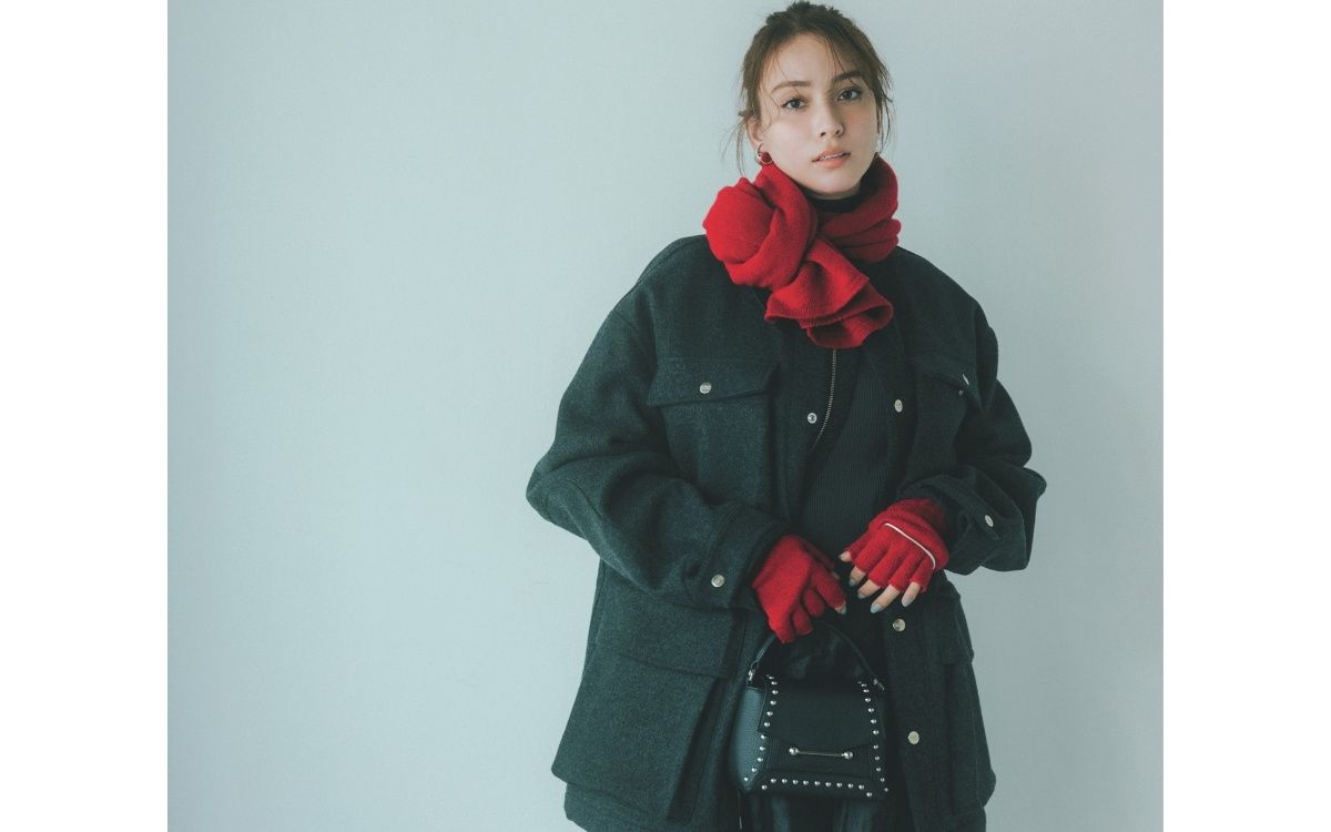 オールブラックの着こなしに、トレンドの赤を差し色で。ストールとグローブのセット使いは行き届いたおしゃれセンスを感じさせる。