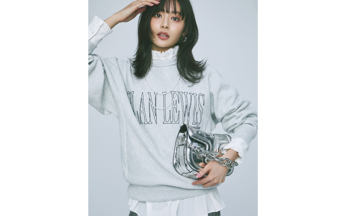 スウェット¥14,300(アダム エ ロペ〈チャンピオン フォー アダム エ ロペ〉) ブラウス¥37,400(フィルム〈ソブ〉) パンツ¥71,500(カオス丸の内〈カオス〉) バッグ¥220,000(ピエール アルディ 東京〈ピエール アルディ〉) ピアス¥16,500(エルディスト ショールーム〈ジャミレイ〉) 3連にしたネックレス¥6,600(AKTE) リング¥176,000(マリハ)