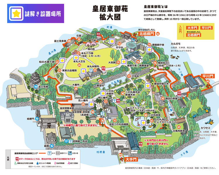 概要:皇居東御苑を周遊しながら手持ちのスマートフォンを使ってチャレンジする、全10問の謎解きゲーム。問題の解説には皇室のご活動や文化に関する説明が添えられています。