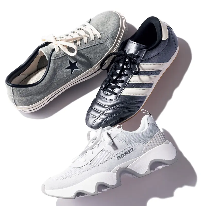 グレーのようなメタリックカラーのスニーカーなら、主役にも脇役にもマルチに活躍。柔和な配色にシルバーの輝きをONしてモードなニュアンスを。