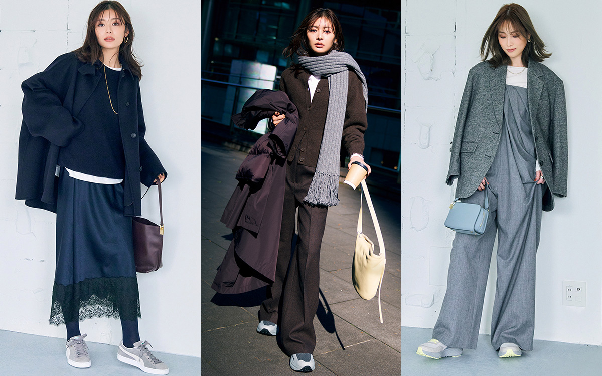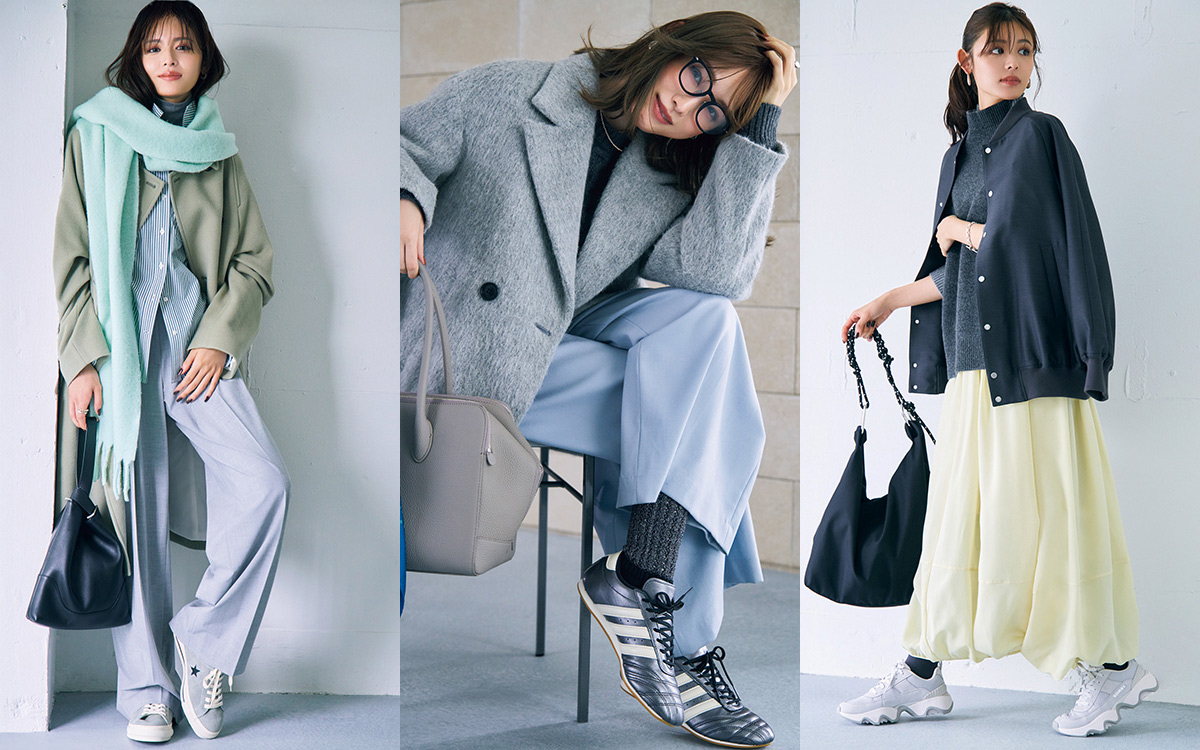 どんな色ともすっと調和して、主役アイテムを引き立てるグレースニーカー。マンネリしがちな冬の装いは、包容力のあるグレーを味方につけた「きれい色」との配色コーデで気分転換!