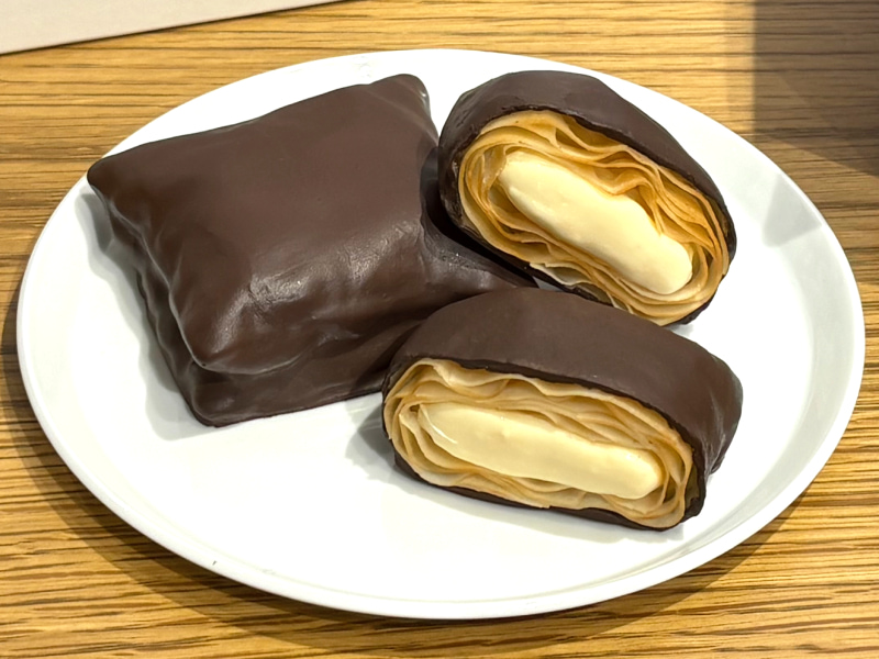 袋を開けると現れるのは、チョコレートでコーティングされたボリュームたっぷりのふっくらパイ。「SNOWS」のこだわりである「冬の放牧牛乳」をふんだんに使ったカスタードクリームが、パイの中にたっぷりと閉じ込められています。