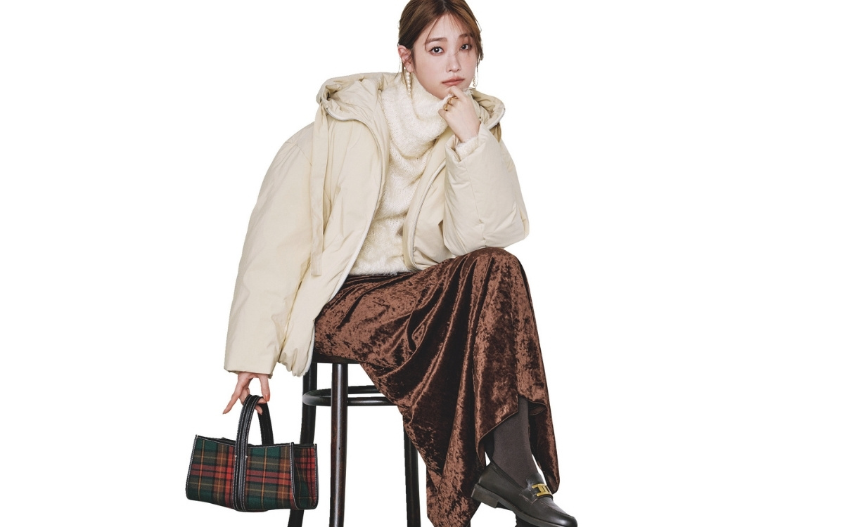ダウンコート¥69,300(GUEST LIST〈upper hights〉) ニット¥39,600(カオス丸の内〈カオス〉) スカート¥18,700(MIESROHE ルミネ新宿1店〈MIESROHE〉) バッグ¥53,900(ノーベルバ〈ア ヴァケーション〉) 靴¥40,700(ダニュウ〈ルカグロッシ〉) ピアス¥39,600(イセタンサローネ東京〈carat a〉) リング[2フィンガー]¥16,500(エルディスト ショールーム〈ジャミレイ〉) タイツ¥5,500(アランチェート〈ファルケ〉)