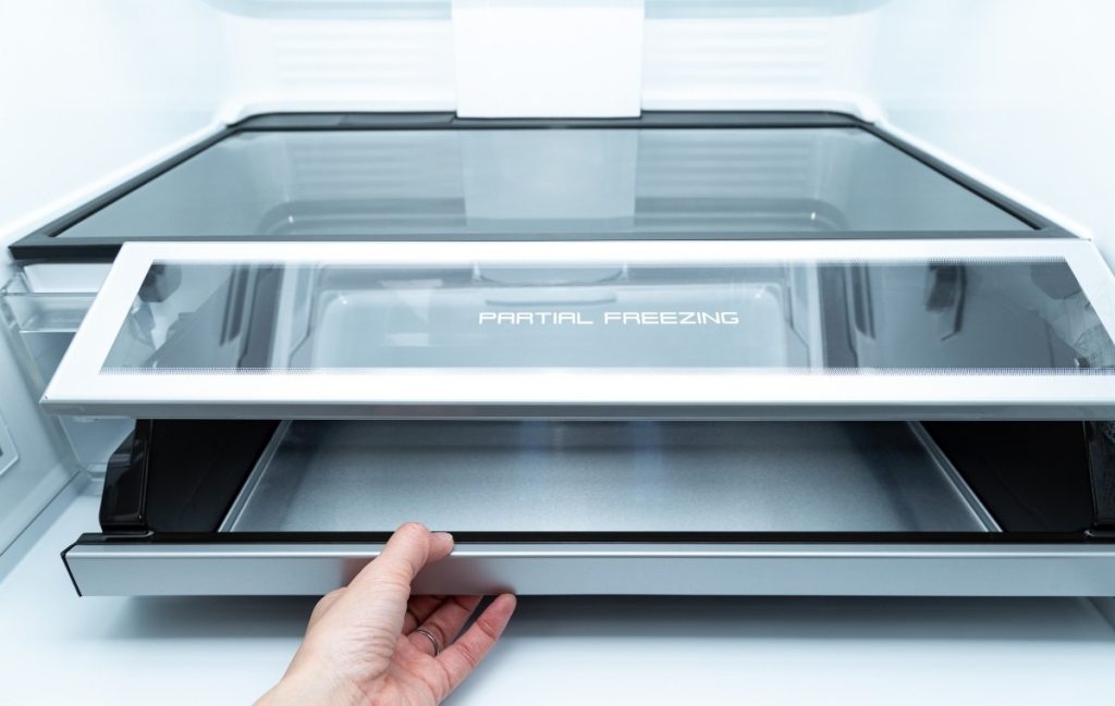 チルド室とは、冷蔵庫の中でも低い温度が保たれているスペースのことです。冷蔵室の温度は通常約2~5℃ですが、チルド室は約0~3℃に保たれています。食品が凍る前の温度を維持しているため、鮮度を長期間キープしたい食材を保管しておく場所として適しているのです。