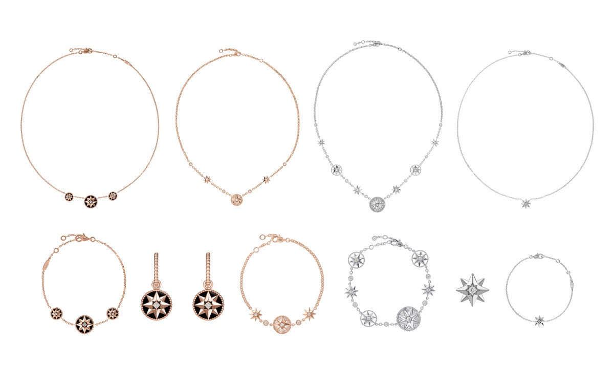 ピンクゴールドまたはホワイトゴールドにダイヤモンドをあしらったネックレスとブレスレットは、「ローズ デ ヴァン」と「エトワール デ ヴァン」を紡ぐデザイン。贅沢に配されたダイヤモンドが優美に輝きます。