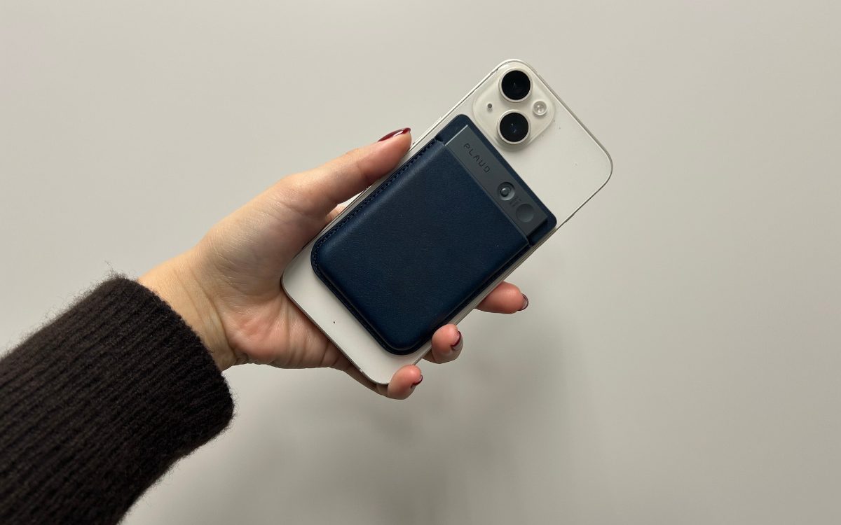 本体はMagsafe対応のレザーケースとセットで、パッと見た印象は「薄型のカードケース」。私はMagsafe非対応機種なので、こんな感じで付属のマグネットシールを貼っています。