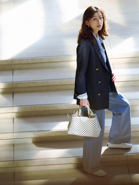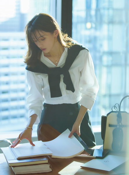 今回モデルを務めるのは、昨年第二子を出産し、仕事復帰したばかりの『Oggi』専属モデル朝比奈彩さん。『Oggi』が考える「かっこいい働くママ」像を、素敵に演じてくれています。