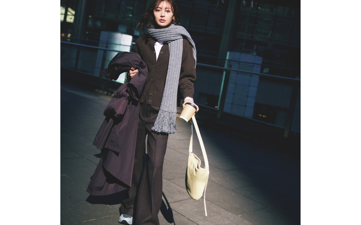 手に持ったコート¥24,900・カーディガン¥9,990・マフラー¥9,990(無印良品 代官山〈MUJI Labo〉) 中に着たカットソー¥20,900(スタニングルアー 新宿店〈スタニングルアー〉) パンツ¥37,400(ブロッサム) バッグ¥37,400(アイネックス〈バケット バゲージ〉) 靴¥19,800(ニューバランスジャパンお客様相談室〈ニューバランス〉) ピアス¥15,950(ココシュニック〈ココシュニック オンキッチュ〉) ブレスレット¥57,200(スクア〈スクア〉)