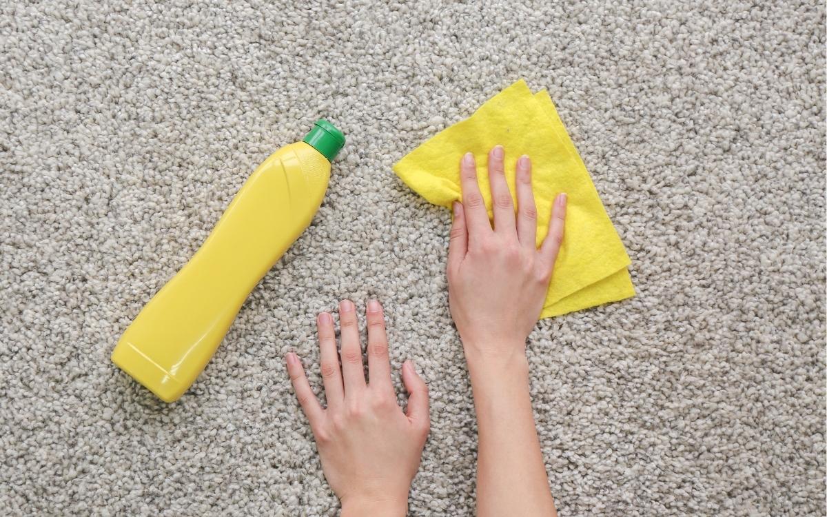 洗剤を含ませた布でカーペットを拭く