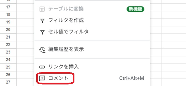 Google スプレッドシートには、共有相手とコミュニケーションを取るために、コメント機能が付帯しています。コメント追加は、以下の手順で行いましょう。