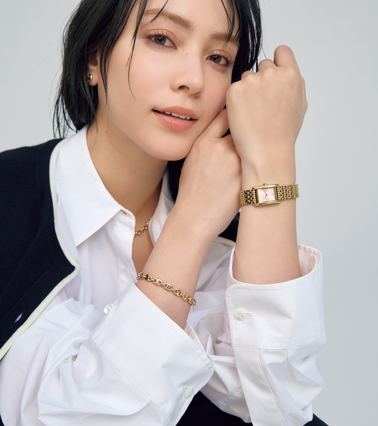 ブレスレット[ジェミニ リンク/18KYGP]¥39,600・ピアス[同/同]¥19,800・ネックレス[同/同]¥59,400・時計[エレノア/SS×YGP/縦28×横19mm/クオーツ]¥53,350・カーディガン¥70,400・シャツ¥89,100(トリー バーチ ジャパン〈トリー バーチ〉) その他/スタイリスト私物