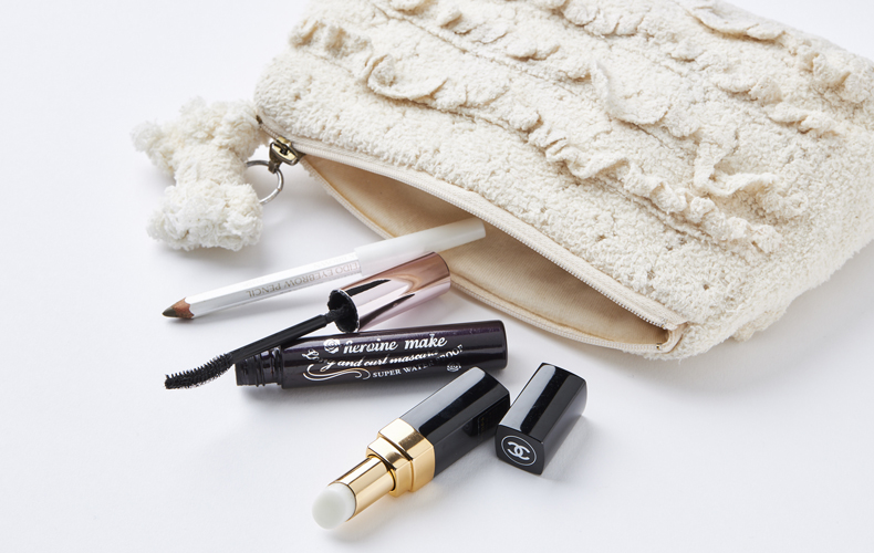▲「3〜4年前に買ったジェラート ピケのポーチは、色味がお気に入り。旅行するときなど、必要最低限のアイテムを入れています。絶対に手放せないコスメはこの3つ! シャネルのリップクリームはスルスルとのびて使いやすい。口紅やグロスを使うと唇が荒れてしまうため、普段は無着色のこのリップだけ塗っています。ヒロインマスカラは、カールキープができるこのタイプを愛用。プチプラの眉墨鉛筆は、一時期姿を見かけなったためいろんなところを探し回りました(笑)。ずっと使っているものなので無事にゲットできてよかったです」