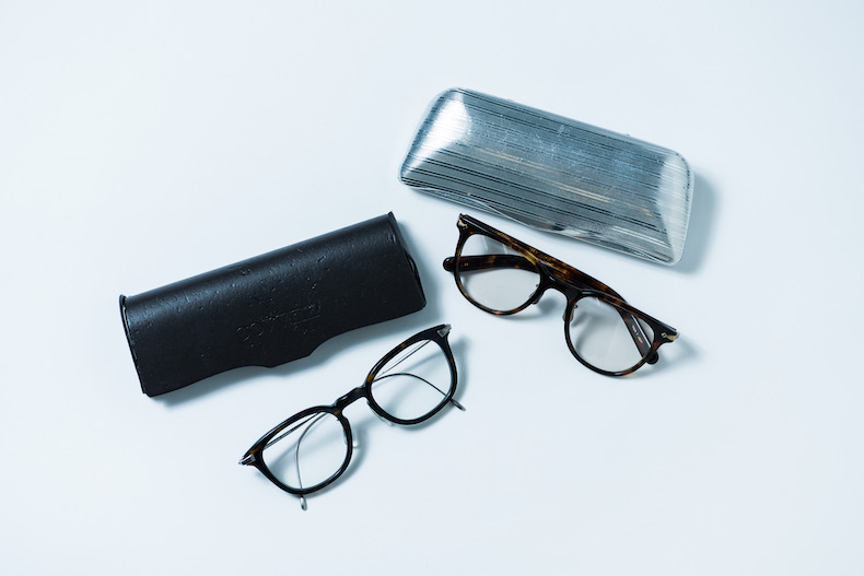 ▲「バーニーズやエストネーションで買うことが多いです。右は紫外線に当たるとサングラスになるメガネ。ひなたに置いておくと、レンズが茶色くなります。左は度なしのメガネ」