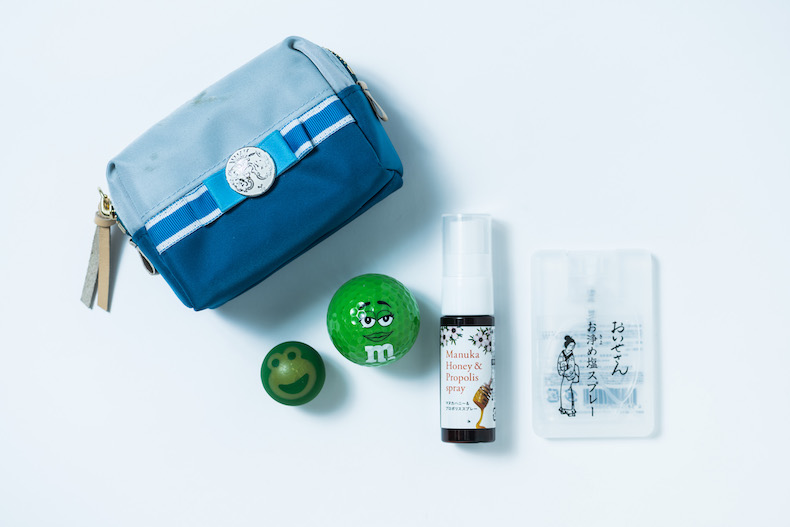 ▲「青のポーチはファンの方からいただいたものですね。これにはケアものを入れています。右はお清めスプレー。この香りで頭が痛いのが治るほど、すごくいい。地方公演のときに泊まるホテルにもこれをシュッと。amazonで気軽に買えて、もう何回もリピートしています。その隣りは、マヌカハニーののどスプレーです。左は、足の裏をほぐすボール。この上に足で乗ってゴロゴロします。広範囲をほぐすときは右の大きい方。左の方は現役のときに、振付けをされているとしこ(鈴懸三由岐)さんにいただいてずっと使っています。スーパーボールなんですけど、小さいから足の裏にめちゃくちゃハマって痛いんですよね」