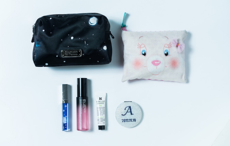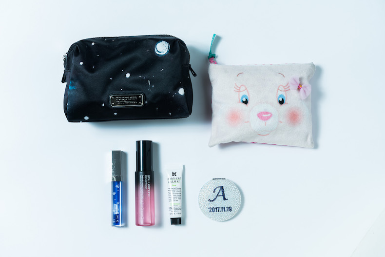 ▲「どちらのポーチもいただいたもので、化粧品を入れています。右のクマのポーチはあきら(瀬戸かずやさん)から。男役なのにこんなかわいいのをくれるなんて、中身おとめだよね(笑)。下の、”A”がデコってあるのは紅ゆずるさんが作ってくれたミラー。私がタカラヅカを退団した日にちを入れてくれました。その隣りはリップクリーム。唇があれやすいので、まめにケアするようにしています。その横にあるのは、桜の時期にもらった桜の香りミスト。とってもいい香りの化粧水です。いちばん左のはグロス。これは友達にもらいました。唇の上でピンク色に変わるんですよ」