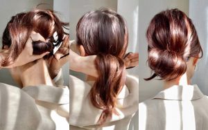 髪全体を手ぐしでひとつにまとめて襟足付近でゴムで結びます。束ねた毛束の中間くらいまでゴムの結び目をずらしたら、毛先を折り返し、ゴムとゴムの間にはさんで固定します。上を向いた毛先を扇状に広げたら完成。顔まわりはサイドから2〜3つの毛束を出し、ルーズ感をプラスします。