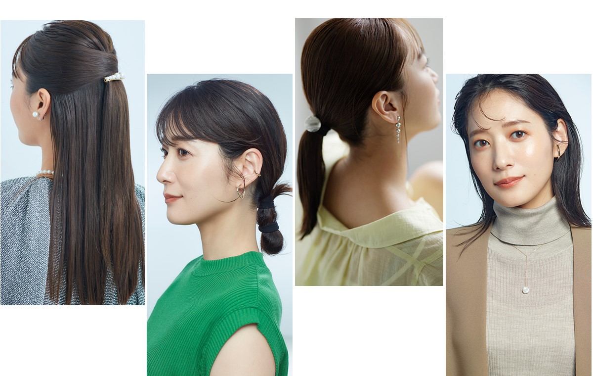 耳のラインより前の髪を残して、他は後ろでひとつ結びに。結び目が高いとカジュアルな印象になり、結び目が低いと落ち着いたイメージになります。