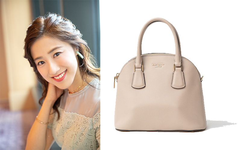 合わせやすいピンクベージュの小ぶりなバッグ。「現役の時は両肩に特大のバッグを持つ生活をしていたりと、本当に荷物が多いので、無理に少なくするように小さめのこちらを買ったんです。購入したのは卒業間近。…でもやっぱり荷物は入りきらなくて、今日はこのバッグ+大きいサブバッグを持っています(笑)」