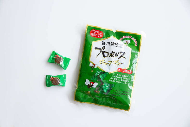 ▲ミツバチが作り出す天然の抗菌物質・プロポリス独特のピリッとした強い刺激を感じるのど飴。腸内環境を整えるオリゴ糖とビール酵母も配合されている。