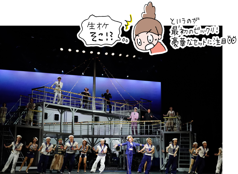 ▲私たちも一緒に船旅をしているかのような舞台セットも立派で見応えアリ。デッキの下にはオーケストラがいて生演奏が楽しめます。