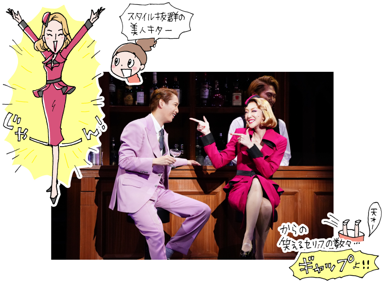 社交界の華・ホープお嬢さまを演じる愛加あゆさんも、宝塚歌劇団の元雪組トップ娘役。可憐で清楚な雰囲気に、ビリーがメロメロになっちゃうのもわかります。