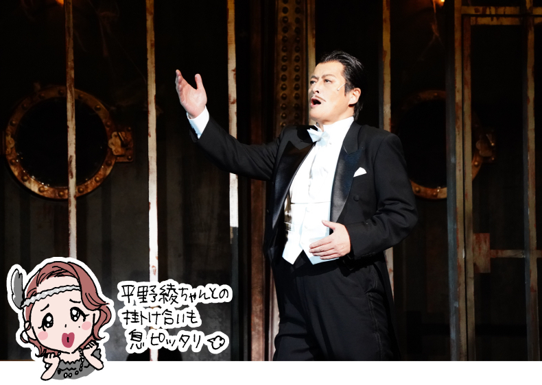 主役は、ナイトクラブのスター・リノ(紅ゆずるさん)。リノがぞっこんのビジネスマン・ビリー(大野拓朗さん)、ビリーが思いを寄せるお嬢さま・ホープ(愛加あゆさん)。でもホープはどうやら英国紳士のオークリー卿(廣瀬友祐さん)と結婚式を挙げるみたいだし、ビリーの上司・ホイットニー社長(市川猿弥さん)と、ホープの母親・イヴァンジェリン(一路真輝さん)となにかありそうで、そんな人間関係をさらに引っかきまわすのが、紳士に変装した指名手配中のギャング・ムーンフェイス(陣内孝則さん)と、彼のオンナのアーマ(平野綾さん)。とにかく役も出演者も濃い! 濃い! 濃いーーー!!