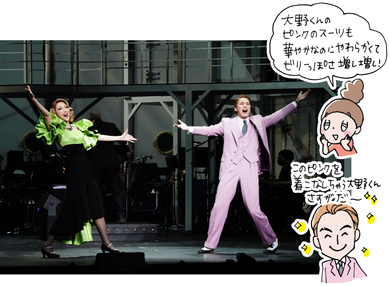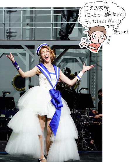 歌とダンスがたっぷりで、ストーリーはとことん陽気。そしてさらなる見どころは、リノの衣装の豊富さ! 何度衣装替えがあったかな…、とにかく半端なくゴージャス。どれもかわいい色使いとデザインで、それを見るだけでもワクワクします。それまた、スタイル抜群の紅さんがさらに素敵に着こなして、見目麗しいこと。紹介しきれなかった衣装を、ここでまとめてお見せしちゃいますよ。