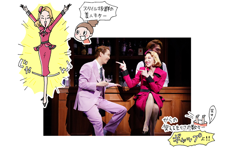 リノ役の紅さんは、宝塚在団中から個性の塊のような人。軽快でコミカルで、大好きなビリーに迫るところなどすごくチャーミング。コメディってセリフのテンポや間が重要ですが、絡みが多かった大野さんや陣内さんとのやりとりはとっても楽しい! 大野さん演じるビリーはウォール街で働くビジネスマンという設定ですが、なかなか自由な性格で、彼がいろんな(面倒な)ことを引き寄せてしまっているんじゃないかと思いつつ憎めない存在。