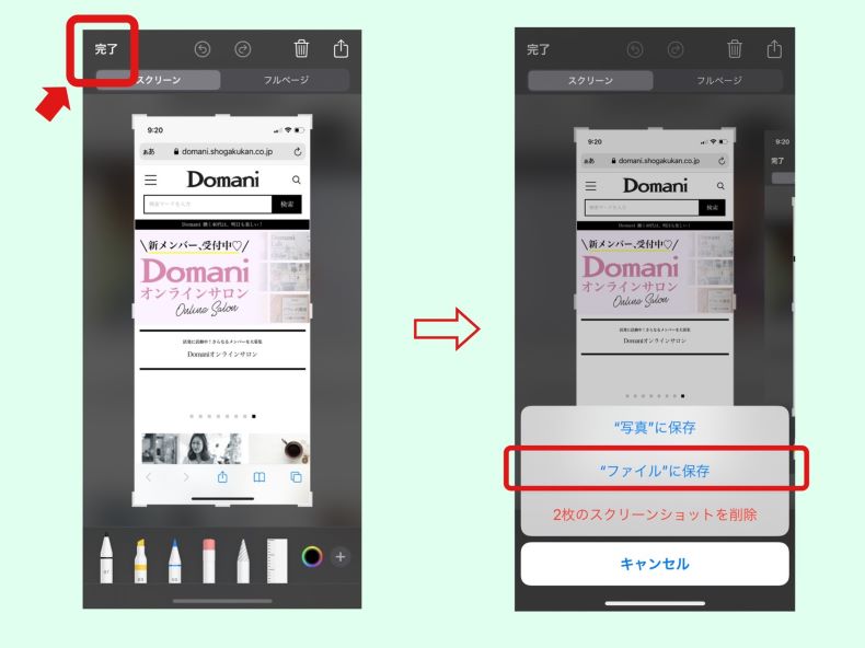 画像の編集が終わったら、そのまま左上の【完了】をタップします。スクリーンの場合は【写真】アプリに保存されますが、フルページの場合は【ファイル】へ移動します。そこをタップすると…