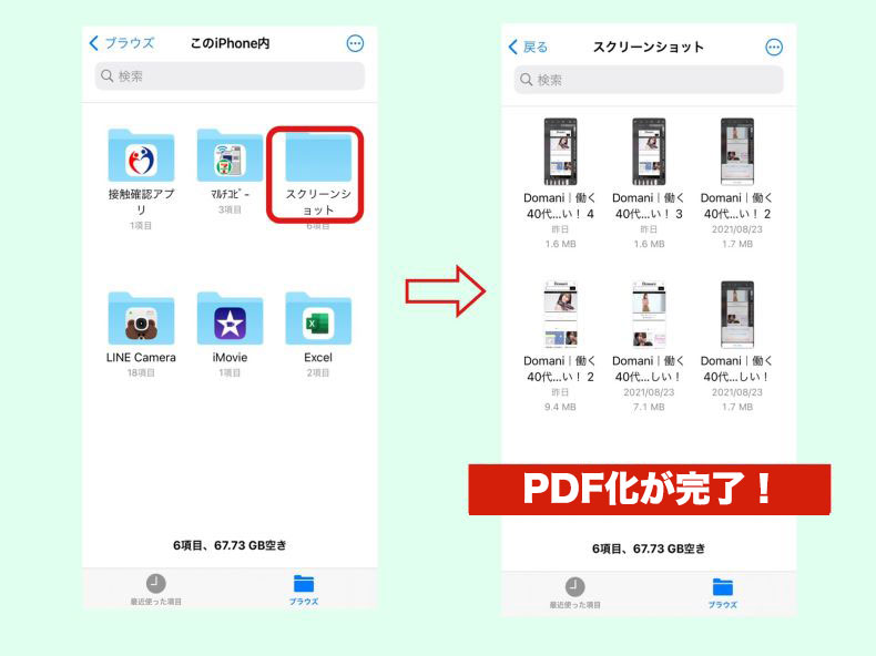 【ファイル】アプリのフォルダ選択画面がでてきます。画像としてではなく、PDFファイルとして保存されています。ここで違うフォルダをタップすると見つけにくくなるので、新規フォルダ作成がおすすめ!